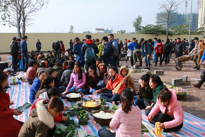 | Các bạn sinh viên Lào cũng hào hứng khi lần đầu được tham gia gói bánh chưng trong Tết cổ truyền Việt Nam |