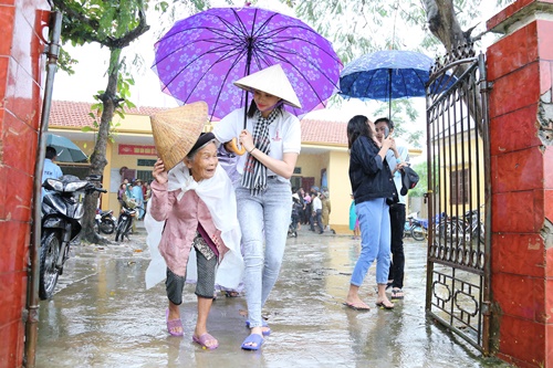 Hoa hậu Phạm Hương như thường lệ vẫn nhiệt tình và lăn xả cùng đoàn. Cô không ngại dầm mưa đạp xe đạp chở từng chị, từng cụ vào hội trường để nhận quà. Đồng thời chuẩn bị thêm rất nhiều kẹo để tặng cho các em nhỏ tại trường.