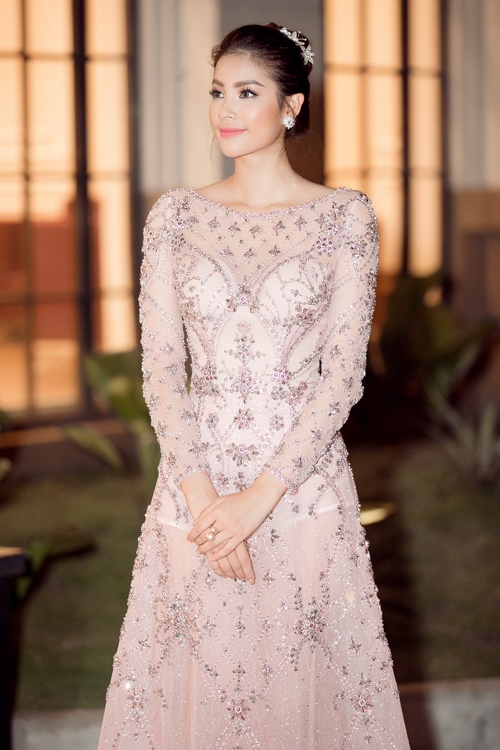 Bộ đầm dạ hội màu hồng pastel được đính kết cầu kì với những viên đá lấp lánh của NTK Đỗ Long đã giúp Phạm Hương cực kì nổi bật trong sự kiện tối qua. |