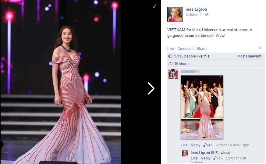 Sau đêm đăng quang, chuyên gia sắc đẹp quốc tế Ines Ligron - người từng đào tạo cho Cựu Hoa hậu Hoàn vũ Riyo Mori đã đăng tải một bức ảnh về Phạm Hương trên trang cá nhân của mình đồng thời khen ngợi về nhan sắc của cô, bà ví người đẹp như một "Barbie doll" (búp bê Barbie) của Châu Á, đồng thời bình luận rằng vẻ đẹp của cô là hoàn hảo thu hút rất nhiều sự chú ý cho Tân Hoa hậu Hoàn vũ của Việt Nam, thậm chí nhiều người đã dự đoán, với vẻ đẹp và thần thái này, Phạm Hương có thể tiến xa tại Hoa hậu Hoàn vũ Thế giới.