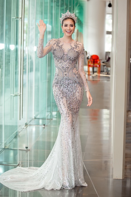Trong bộ váy dạ hội lộng lẫy của Nhà thiết kế Đỗ Long, Phạm Hương vẫn chứng tỏ được sự thu hút đặc biệt và luôn chỉnh chu trong từng sự kiện. Theo như tiết lộ của Đỗ Long, bộ váy này đã được 6 thợ may làm liên tục trong 300 giờ để Phạm Hương có được bộ trang phục ấn tượng nhất trong sự kiện chiều nay.