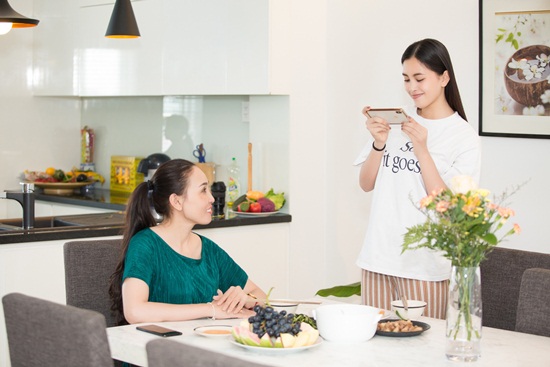 | Tiểu Vy chia sẻ, ý nghĩa hơn hết là mùa 8/3 năm nay dù với cương vị mới, cô vẫn có thời gian bên mẹ mình để trò chuyện, nấu ăn và ăn những món ăn mẹ nấu như thời còn ở nhà. |