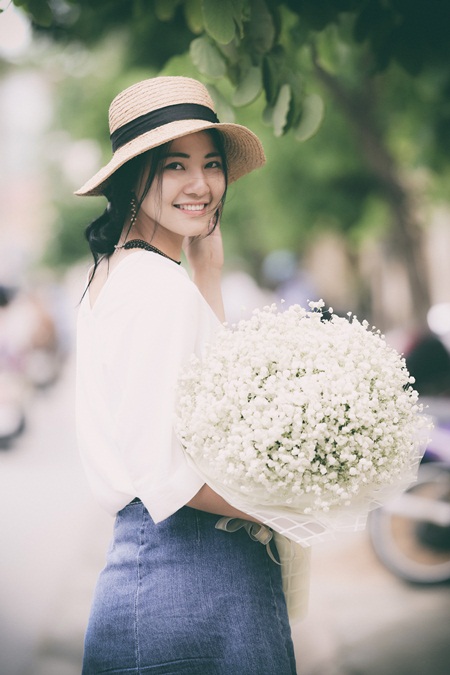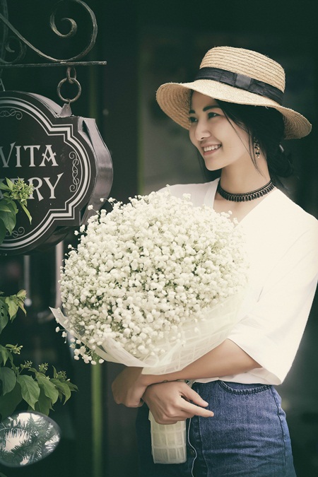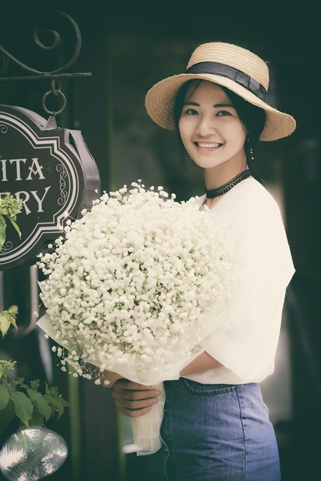 (ĐSPL) - Hoa hậu Trần Thị Quỳnh không khác gì một cô học sinh mơ mộng với bó hoa babi trắng thuần khiết.