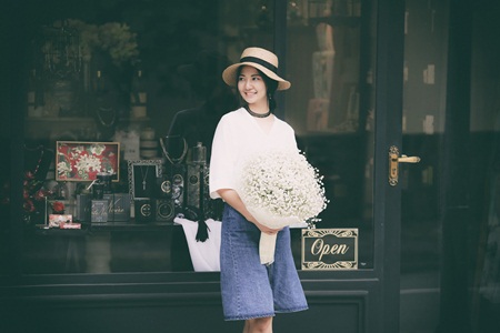 | Tươi tắn, trẻ trung như một cô gái với áo sơ mi trắng, chân juyp denim giản dị, những khoảnh khắc đời thường của bà mẹ một con Trần Thị Quỳnh dễ khiến người ta thấy cô không khác gì một cô học sinh mơ mộng với bó hoa babi trắng thuần khiết. |