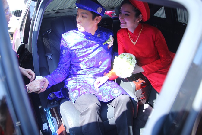 Khoảng 9h30, chú rể John Từ cùng họ hàng nhà trai đã có mặt tại tư gia Trúc Diễm để làm lễ rước dâu theo các nghi thức truyền thống. Trong ngày hạnh phúc của mình, cô dâu Trúc Diễm vô cùng xinh đẹp với áo dài truyền thống màu đỏ rực rỡ bên chú rể John Từ điển trai với chiếc áo dài màu xanh đậm. Cặp đôi không giấu được niềm hạnh phúc trên gương mặt.
