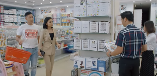 Cuộc gặp gỡ của San và Nguyên với Thái trong khu bán đồ trẻ con của siêu thị. |