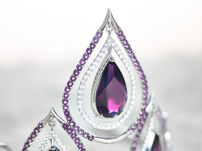 Theo đó, để có được 4 viên đá Amethysttím sáng phóng tác thành những giọt sương, các nghệ nhân phải chọn và mài dũa từ 5,000 gram đá nhằm đảm bảo độ đồng màu. Bên cạnh đó, hơn 100 viên đá tím nhỏ và hơn 150 viên kim cương Pháp cũng trải qua quá trình tuyển chọn gắt gao để sử dụng làm đường viền, mang lại đường nét tinh tế và giúp cho 4 giọt sương – tượng trưng cho 4 mùa trong năm luôn toả sáng và lấp lánh.