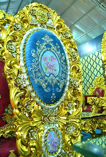 Cùng với đó là những bông hoa mạ bạc. Phía trên đỉnh của tựa ghế là bông hồng được làm từ đồng đúc, với đường nét tinh xảo tỉ mỉ từng chi tiết với tổng thể sang trọng.