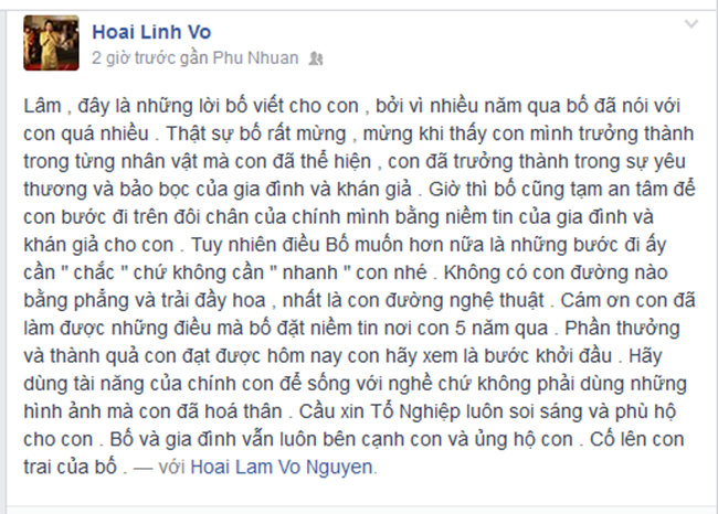 Tuy nhiên điều Bố muốn hơn nữa là những bước đi ấy cần "chắc" chứ không cần "nhanh " con nhé. Không có con đường nào bằng phẳng và trải đầy hoa, nhất là con đường nghệ thuật. Cám ơn con đã làm được những điều mà bố đặt niềm tin nơi con 5 năm qua. Phần thưởng và thành quả con đạt được hôm nay con hãy xem là bước khởi đầu... Hãy dùng tài năng của chính con để sống với nghề chứ không phải dùng những hình ảnh mà con đã hoá thân. Cầu xin Tổ Nghiệp luôn soi sáng và phù hộ cho con. Bố và gia đình vẫn luôn bên cạnh con và ủng hộ con. Cố lên con trai của bố".