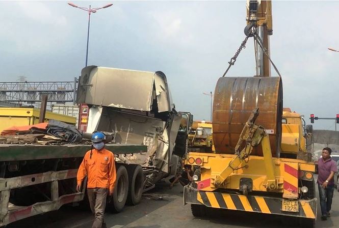 Cuộn sắt hơn 20 tấn đè bẹp cabin xe container. Ảnh: SGGP |