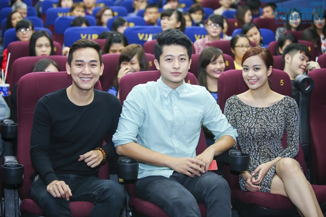 Hoàng Thùy Linh, Harry Lu (giữa) và Hứa Vĩ Văn xem lại phim và giao lưu khán giả. |