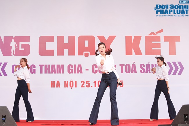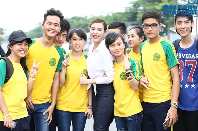 Để phần biểu diễn càng thêm sôi động nữ ca sĩ xinh đẹp đã xuống tận nơi để mời từng đại diện của các trường ĐH lên nhảy múa phụ họa trong bài hát tiếp theo của mình. |