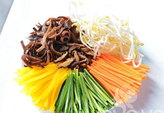 Rau cải bó xôi qua nước sôi sau đó, vớt ra cho ráo nước hoặc vắt cho hết nước. Sau đó, thái nhỏ vừa ăn, ướp rau với chút muối, chút dầu mè , chút vừng rang. Làm tương tự với giá đỗ và nấm kim châm (Trần và ướp với muối, dầu mè và vừng rang).