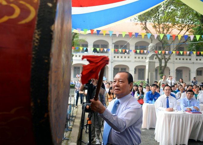 Nhà giáo Văn Như Cương đánh trống khai giảng năm học mới. |