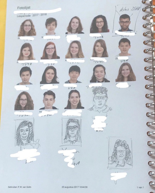 "Lười in hình mấy bạn mới vào danh sách lớp quá nên thầy mỹ thuật của tôi tự vẽ chân dung họ vào luôn". |