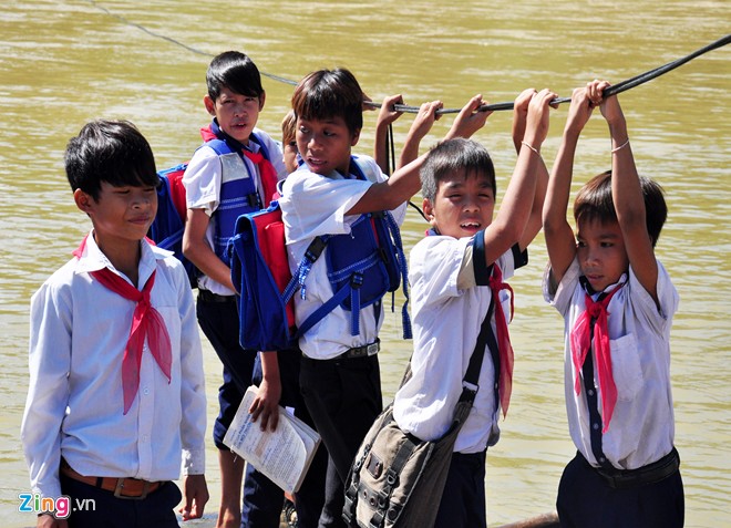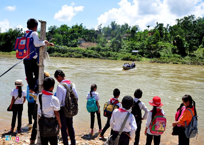 Hàng trăm học sinh xã Sơn Bao (huyện Sơn Hà, Quảng Ngãi) hàng ngày phải đu dây kéo bè, ghe vượt sông sâu nước xiết đến trường trong điều kiện hiểm nguy rình rập.