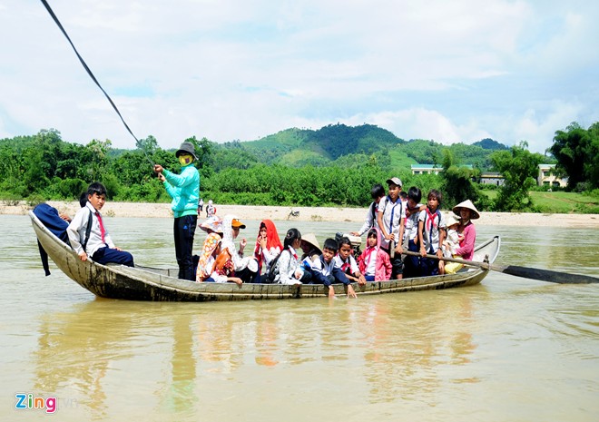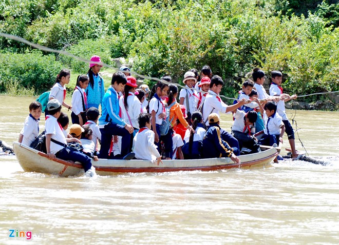 Để cho kịp giờ, học sinh luôn phải chen chúc lên chiếc ghe nhôm đu dây vượt dòng nước xiết đến trường và về nhà.