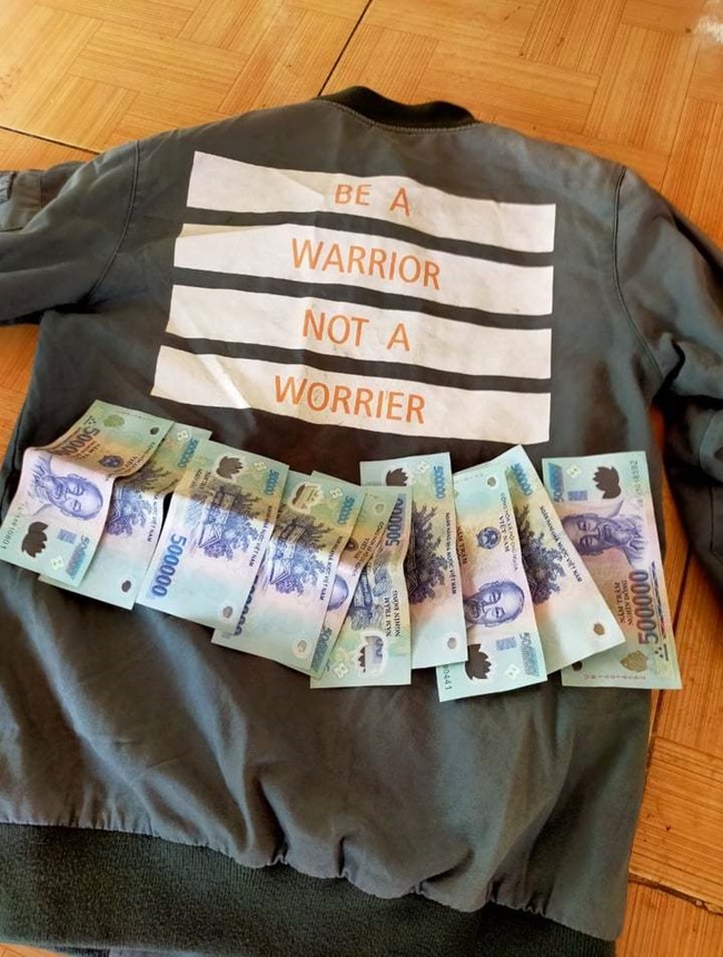 Áo khoác có chứa số tiền 5 triệu đồng nằm trong túi cứu trợ của đoàn “Chị Phượng cùng bạn bè ở TP.HCM” gửi ra cho học sinh vùng núi huyện Vĩnh Linh sau đợt bão lũ vào tháng 10 vừa qua.