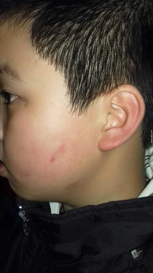 Theo hình ảnh trong clip đăng tải thì má của L. có một vài vết xước, sưng đỏ và L. cho biết, em vẫn bị ù tai, đồng thời cảm thấy sợ.