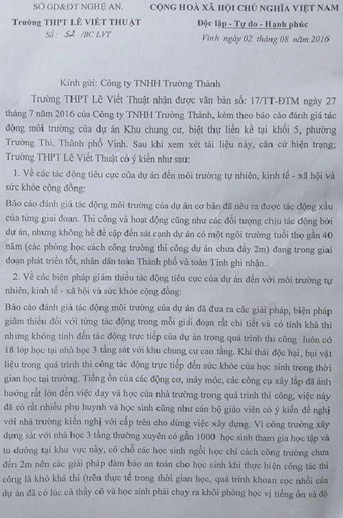 Công văn ngày 2/8 gửi Công ty TNHH Trường Thành của trường THPT Lê Viết Thuật ghi rõ: "Vì công trường xây dựng sát với nhà học 3 tầng thường xuyên có gần 1000 học sinh tham gia học tập và tu dưỡng tại khu vực này, có chỗ các học sinh ngồi học chỉ cách công trường chưa đến 2m nên các giải pháp đảm bảo an toàn cho học sinh khi thực hiện công tác thi công là khó khả thi…".