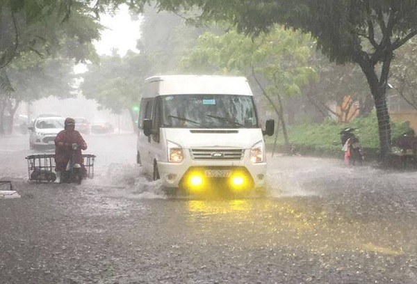 Các xe ô tô hầu như đều bật đèn di chuyển trong điều kiện mặt đường bị ngập úng - Ảnh: VTC News |