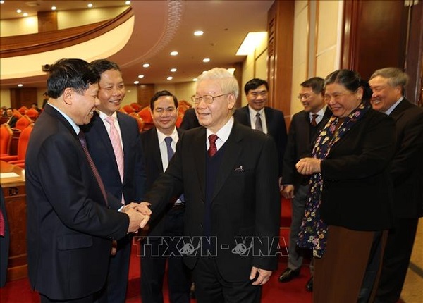 Tổng Bí thư, Chủ tịch nước Nguyễn Phú Trọng và Thủ tướng Nguyễn Xuân Phúc với các đại biểu dự bế mạc Hội nghị. |