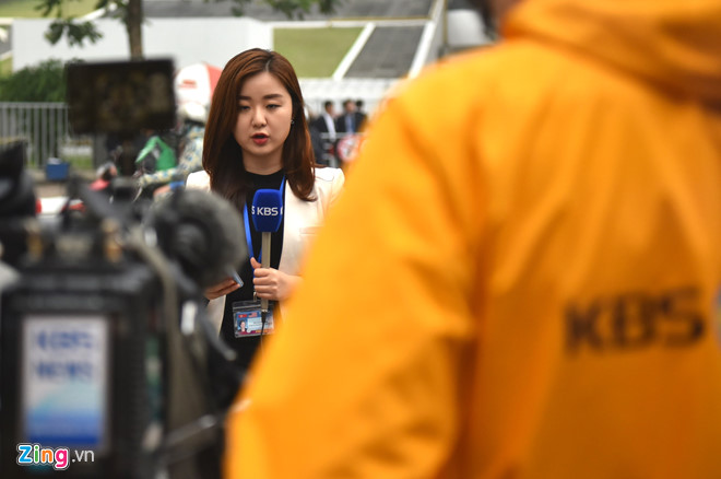 | Hàng chục báo đài, chủ yếu là từ Nhật Bản, Hàn Quốc, "canh" ở cửa sau của khách sạn Marriott để đợi đoàn xe của Tổng thống Trump sẽ đi ra. |