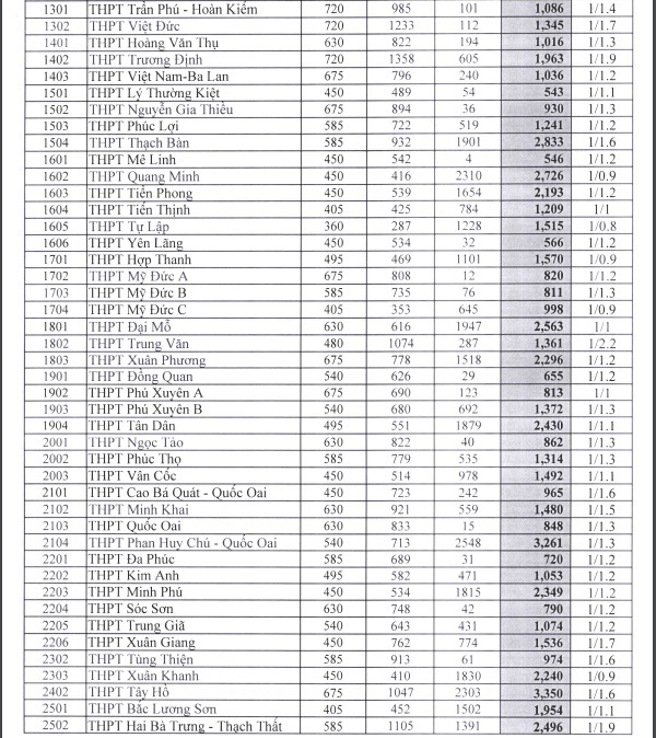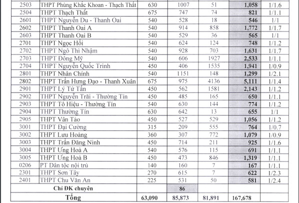 Theo đó, trường có tỷ lệ chọi cao nhất là THPT Chu Văn An là 1/2,4. Tổng chỉ tiêu vào trường là 225 nhưng tổng số nguyện vọng là 581. Đứng thứ hai là THPT Sơn Tây, với tỷ lệ chọi là 1/2,3. Trong đó, chỉ tiêu là 270 nhưng số nguyện vọng đăng ký là 622.