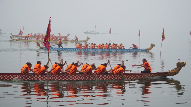 Đúng 10h, các đội đua thuyền được BTC sắp xếp bơi thử trước khi vào màn đấu chính thức. Mặc dù thời tiết mưa dày, tầm nhìn hạn chế nhưng lễ hội vẫn thu hút hàng nghìn người tới xem.