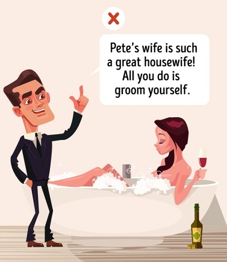 Không bao giờ so sánh người bạn đời của bạn với người chồng hoặc người vợ của người khác nếu sự so sánh đó nhằm chứng tỏ họ yếu kém hơn. Thay vì đặt ai đó làm ví dụ, hãy tập trung vào những ưu điểm tích cực mà người bạn đời của bạn có, để họ cảm thấy được sự tôn trọng từ đối phương.
