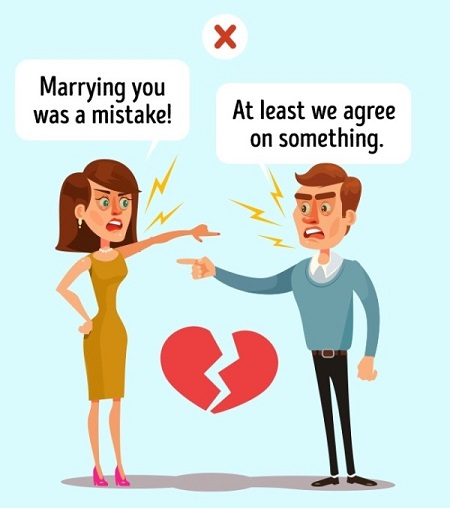 Không có câu nói nào có thể mang tính “sát thương” hơn: “Giá mà ngày xưa chúng ta đừng gặp nhau”. Điều đó sẽ làm cho đối tác của bạn nghĩ rằng: Anh ta/ cô ta toàn mang lại điều tồi tệ cho bạn, và bạn đang hối hận vì cuộc hôn nhân của 2 người. Khi tức giận, người ta thường chỉ nhớ về những điểm xấu xa của nhau, mà quên đi mất đã từng có những gì tốt đẹp. Bạn hãy thử nghĩ xem bản thân bạn đã thực sự cố gắng trong mối quan hệ của 2 người hay chưa? Mỗi người đều tự có những lựa chọn của mình, thế nên đừng bao giờ để đối phương thực sự nghĩ rằng 2 bạn là sự lựa chọn sai lầm của nhau.