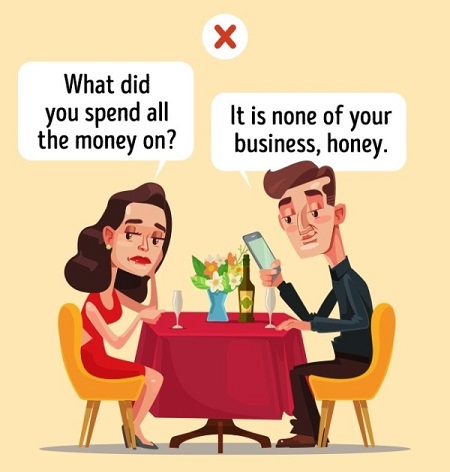 Nếu bạn nói với bạn đời rằng "Đây không phải là việc của anh", hoặc "Tôi không có trách nhiệm phải báo cáo cho anh", điều đó chứng tỏ rằng bạn đang không tôn trọng họ và họ thực sự chả có giá trị gì trong cuộc sống của bạn cả. Điều đó đồng nghĩa với việc họ nên ra đi, hoặc mối quan hệ này nên chấm dứt.