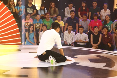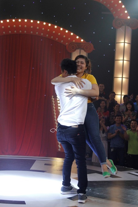 Ngay lập tức, Trường Giang mạnh mẽ nói với thí sinh rằng: “Mình là người chồng trong gia đình thì mình phải quyết định”. Bên dưới, khán giả ra sức làm dấu hiệu khuyên thí sinh nên dừng lại.
