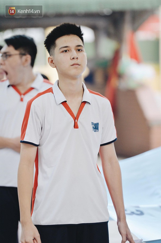 Hot boy cầm cờ Hồng Đăng khoe vẻ điển trai trong bộ đồng phục thể dục của trường. |