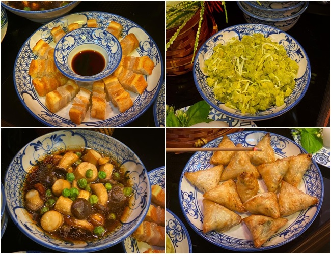 Món thịt ba chỉ chay, chả giò chay, nấm đùi gà kho, xôi cốm dừa ngọt. |