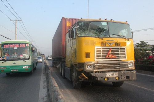 Lúc này, chiếc xe container BKS 51C- 381.36 kéo theo rơ mooc lưu thông cùng chiều chạy tới bất ngờ húc vào đuôi xe khách khiến chiếc xe khách bị đẩy về phía trước, lao lên dải phân cách của xe máy và ô tô.