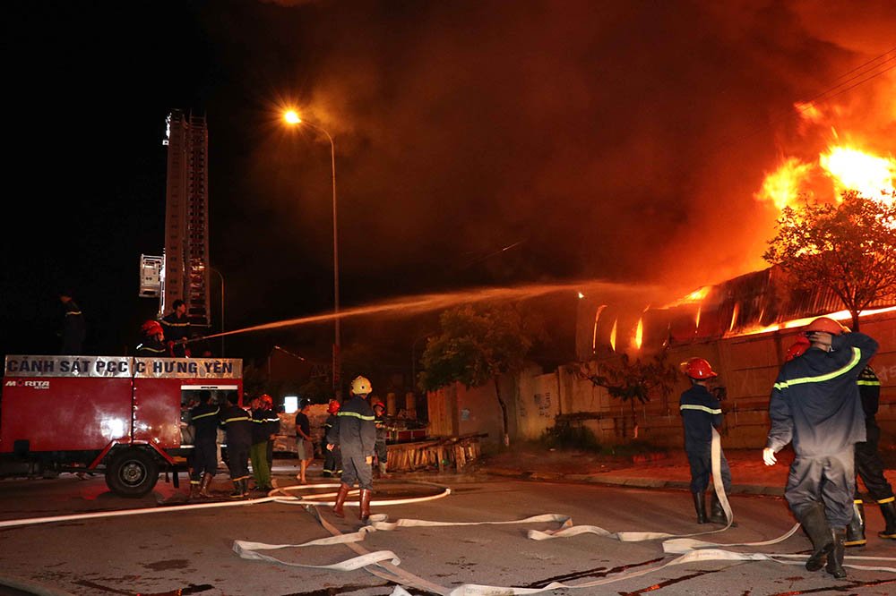 Cảnh sát PCCC Hưng Yên đã huy động hàng chục chiến sĩ cùng nhiều xe nước đến hiện trường. Đến 21h30, các lực lượng vẫn đang tập trung chữa cháy.