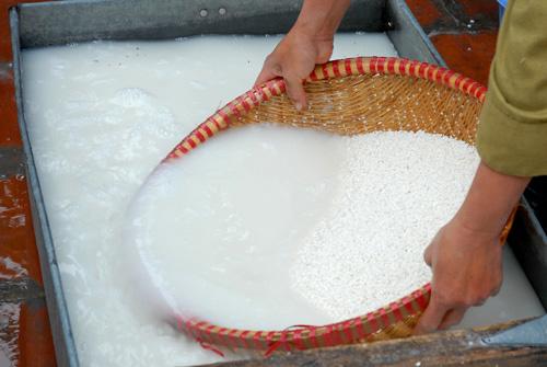 Bạn hãy lấy số lá dứa đã chuẩn bị, sau đó xay nhuyễn và lọc lấy nước cốt. Sau đó trong một cái thau lớn, bạn hòa nước lạnh vào thau rồi bỏ vào đó một chút muối, thêm nước cốt lá dứa vào và khuấy đều. Sau cùng bạn cho gạo vào ngâm trong 3 tiếng. Nếu bạn ngâm gạo quá lâu sẽ khiến gạo bị chua và giòn gãy.