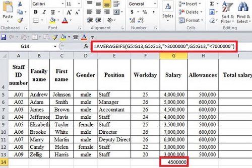 - Kết quả tính trung bình cộng tiền lương hàm AVERAGEIFS sẽ trả về là 4,5 triệu đồng.