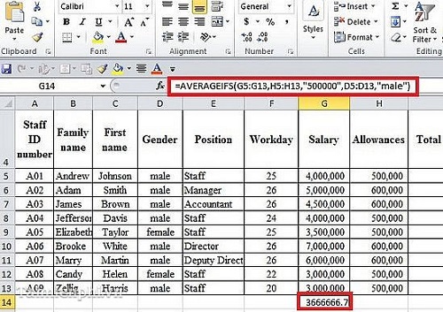 - Kết quả trung bình cộng tiền lương hàm AVERAGEIFS trả về là 3,666,667