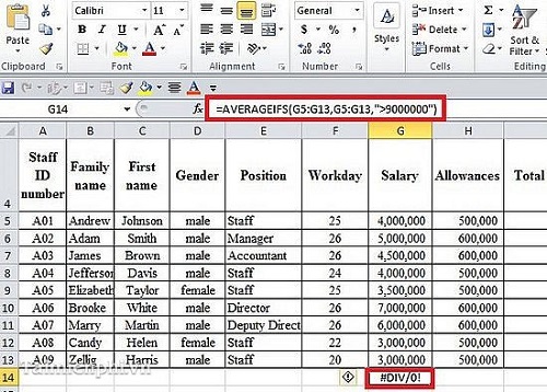 - Kết quả tính trung bình cộng tiền lương hàm AVERAGEIFS trả về là #DIV/0!