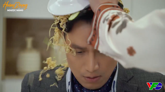 Ngay khi Hoàng vừa ngồi xuống bàn, Minh đã đổ thẳng đĩa mì lên đầu anh. |
