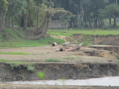 Tận mắt tại hiện trường, những đống ống hút cát đủ loại lớn bé nằm ngổn ngang ngay cạnh khu vực hồ nước. Các bờ đất xung quanh hồ có hiện tượng bị sạt lở, sụt lún nghiêm trọng do quá trình khai thác cát diễn ra nhiều tháng nay.