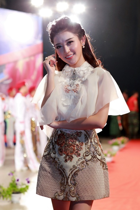 | Xuất hiện tại chương trình, Á hậu Huyền My ăn mặc khá giản dị với bộ váy ngắn thanh lịch nhưng vẫn quyến rũ. Chân váy được thêu hoạ tiết cầu kỳ và sang trọng, trong khi đó phần trên được may khá ấn tượng với voan trắng mỏng manh mang lại vẻ yêu kiều và tinh tế. |