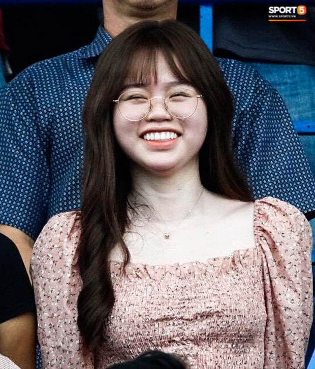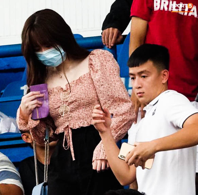 Huỳnh Anh tìm chỗ ngồi cùng "người chị thân thiết" của Quang Hải trên sân Gò Đậu. Khi bỏ khẩu trang, cô nàng để lộ nét mặt mệt mỏi hơn mọi ngày. Cô nàng vẫn cố tỏ ra mình ổn, đến sân cổ vũ bạn trai.