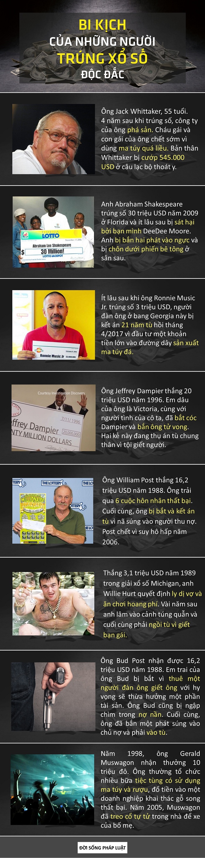 Theo một thống kê khác tại Mỹ, có tới 70% số người trúng xổ số đã tiêu tán tài sản của mình trong vòng 7 năm. Không chỉ vậy, hầu hết họ đều có những kết cục bi thảm, thậm chí có người đã thiệt mạng.