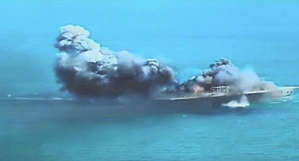![]() Tàu sân bay mô hình bốc cháy sau khi trúng hàng loạt tên lửa hành trình, đạn đạo. |
