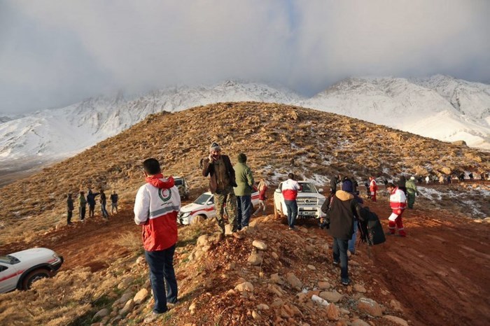 Lực lượng tìm kiếm của Iran tiếp cận hiện trường máy bay rơi. |