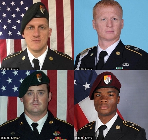 4 quân nhân Mỹ bị sát hại là thượng sĩ Bryan Black, 35 tuổi; Thượng sĩ Jeremiah Johnson, 39 tuổi; Trung sĩ La David Johnson, 25 tuổi; thượng sĩ Dustin Wright, 29 tuổi. Ngoài ra, còn có 2 binh sĩ đặc nhiệm Mỹ bị thương, tuy nhiên danh tính được giữ kín.
