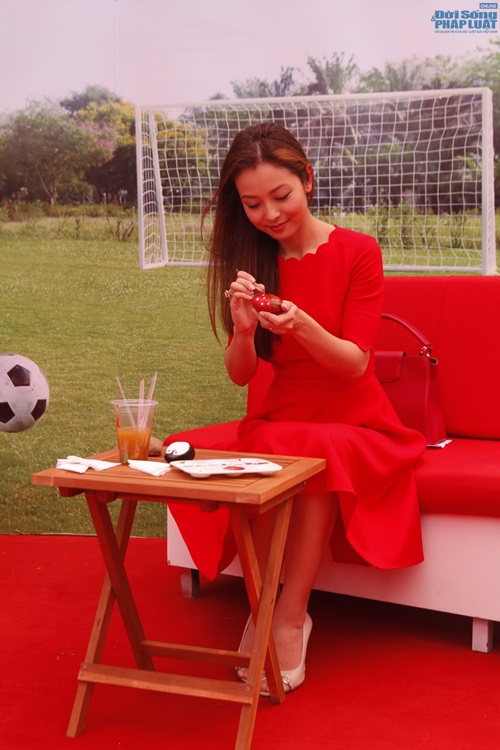 Xuất hiện trong sự kiện này, Jennifer Phạm diện chiếc đầm đỏ rực kín mít nhưng vẫn rất gợi cảm. |